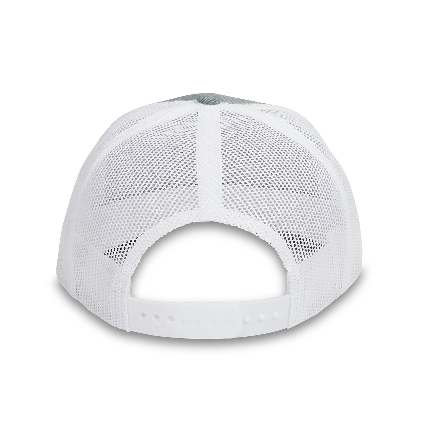HillBilly grey and white pro style trucker hat with black patch and snapback closure